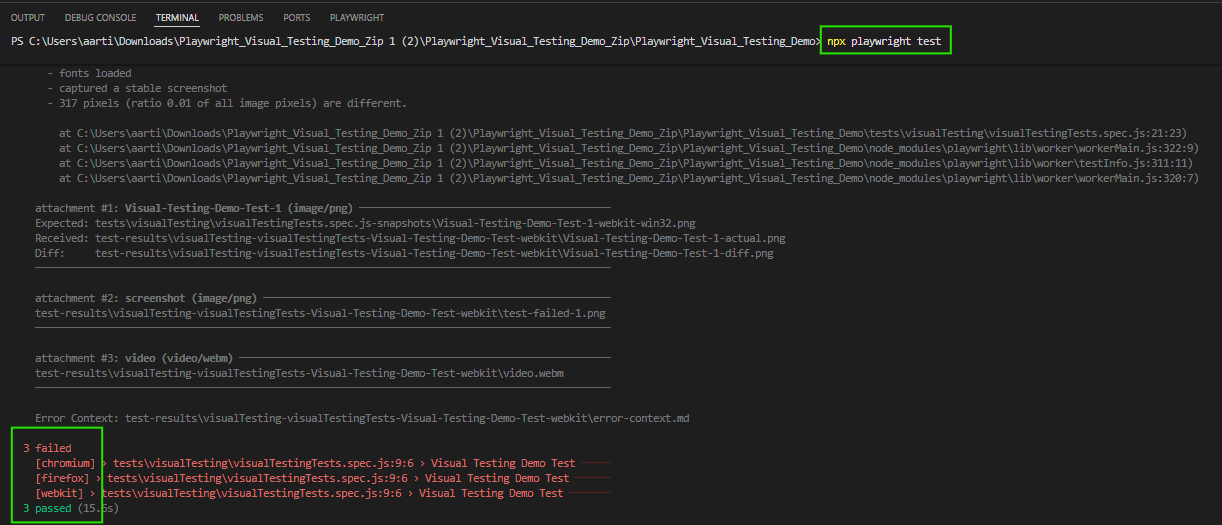 - Debugging and Troubleshooting: When a test doesn’t work, Playwright’s reports give you clear details like error messages, step-by-step paths of what went wrong, and pictures of the screen at the time. This helps you find and fix the main problem quickly, making the whole debugging process smoother.