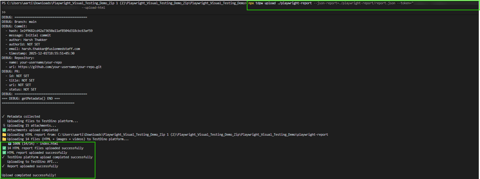 To send your test results to TestDino, run the upload command and pass: