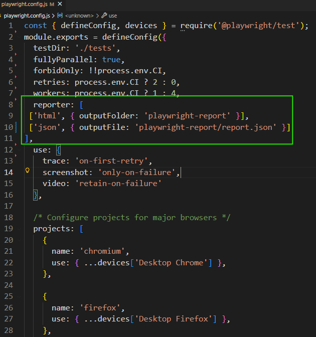- Instead of specifying the reporter in the command line, we can configure it under the reporter property in the playwright.config.js file.